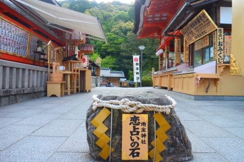 【1】地主神社:“恋占いの石”とよばれる二つの石があり、目を閉じたまま反対側の石にたどり着くことができれば恋が叶う、という言い伝えがあります。<地主神社のスポット情報>