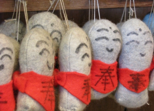 【6】鈴虫寺:黄色い幸福御守を手にはさんで願うと、わらじを履いたお地蔵さんがみんなの願いを叶えに歩いて来てくれると言われています。<鈴虫寺のスポット情報>