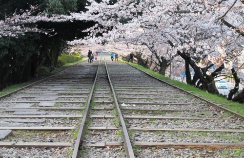 【12】蹴上インクライン:南禅寺の近くにある、世界最長の傾斜鉄道跡。線路に降り注ぐように咲き誇るピンク色の桜と線路が織りなす光景が絶景です。<蹴上インクラインのスポット情報>