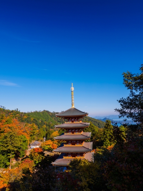 【7】成相寺:日本三景の一つである天橋立を一望できる景勝地としても知られ、紅葉シーズンには五重塔周辺が紅葉で彩られます。<成相寺のスポット情報>