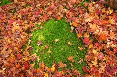 【13】三千院:山間の盆地のため寒暖差が激しく、色鮮やかな紅葉が見られる名所です。紅葉時期には緑の苔に鮮やかなもみじの葉が積もります。<三千院のスポット情報>