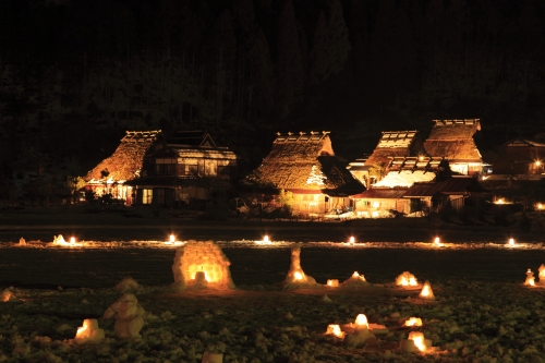 【2】かやぶきの里:数多くのかやぶき屋根の民家を残す地域で、国の重要伝統的建造物群保存地区。例年1月末〜2月頭にかけて、雪灯廊と題したライトアップイベントが開催されています。<雪灯廊のイベント情報>