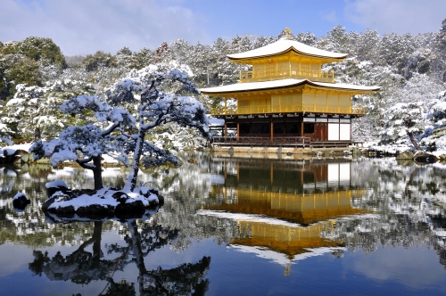 【3】金閣寺:冬の雪景色の中に佇む金閣寺の姿はまた格別の美しさ。雪が積もるほどに降る日は例年数日しかないので、見られたら貴重な冬だけの絶景です。<金閣寺のスポット情報>
