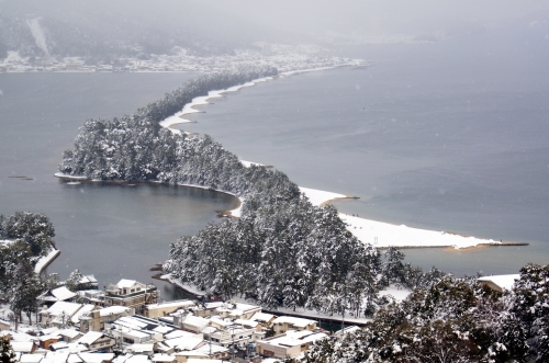 【8】天橋立:白砂青松の美しさで知られる景勝地ですが、冬、天橋立に立ち並ぶ松の葉に雪が降り積もった時だけ、まるで水墨画のような景色へと変わります。<天橋立のスポット情報>