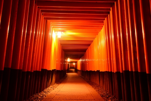 【1】伏見稲荷大社:24時間参拝でき、夜訪れる人も増えています。暗闇の中、わずかな灯篭に灯された朱い鳥居のトンネルは、昼とはまた違った独特の雰囲気を醸し出します。<伏見稲荷大社のスポット情報>
