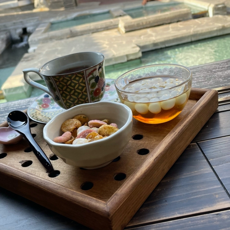 縁側の席に座れたならラッキー!湧水のある風景を眺めながら、もちっとしたお団子と上品な甘みのシロップがベストマッチの、島原ならではのスイーツをいただいてみてください。