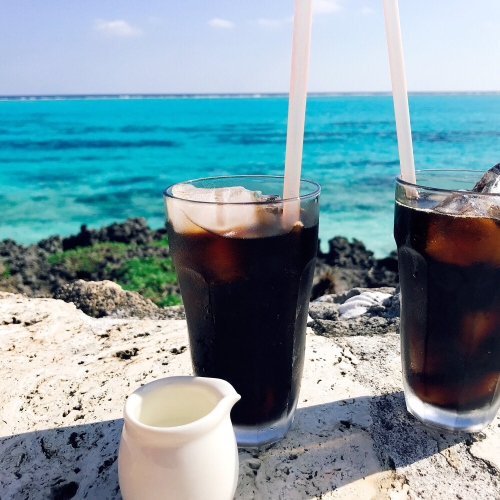 与論島の中心地からはすこし離れますが、島で一番人気の高いカフェがくじらカフェです。くじらカフェの一番の魅力はなんと言ってもオーシャンビュー!ソファー席に座ると、全面にヨロンブルーの海が広がり、まさに絶景!またガーデンにはハンモックもあって、ヨロンブルーの風を満喫できます。