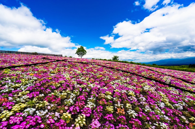 阿蘇国立公園内の久住高原に広がる「くじゅう花公園」。くじゅう連山や遠くに阿蘇五岳を背景に、春から秋にかけて約500種300万本の花々が咲き誇ります。