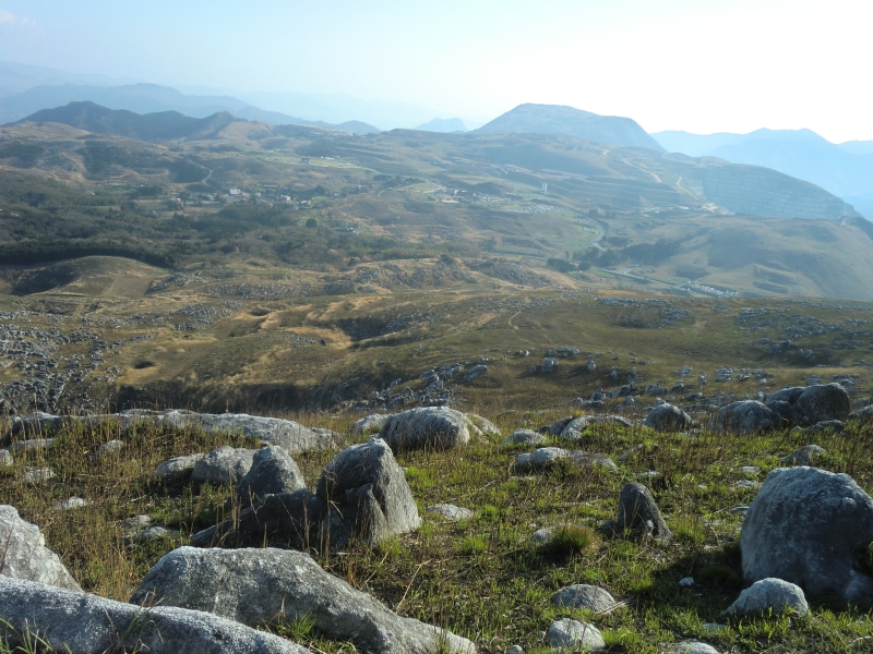 標高300~700m、南北6km・東西2kmにかけて広がるカルスト台地で、山口県の秋吉台や四国カルストと並ぶ「日本三大カルスト」の1つです。カルスト台地とは、石灰岩で形成された大地が長い年月をかけて雨や地下水などで侵食され、独特の地形を形づくったもの。「ドリーネ」と呼ばれるすり鉢状にくぼんだ特有の地形も、至る所に見ることができます。