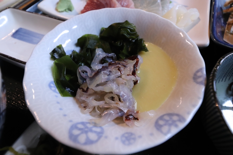 筆者はワカメとクラゲの酢味噌和えを頂きました。若干の薬臭さを感じながらも、こりこりしたクラゲ独特の食感を楽しみました。クラゲはカロリーが低く、おつまみにぴったりです。