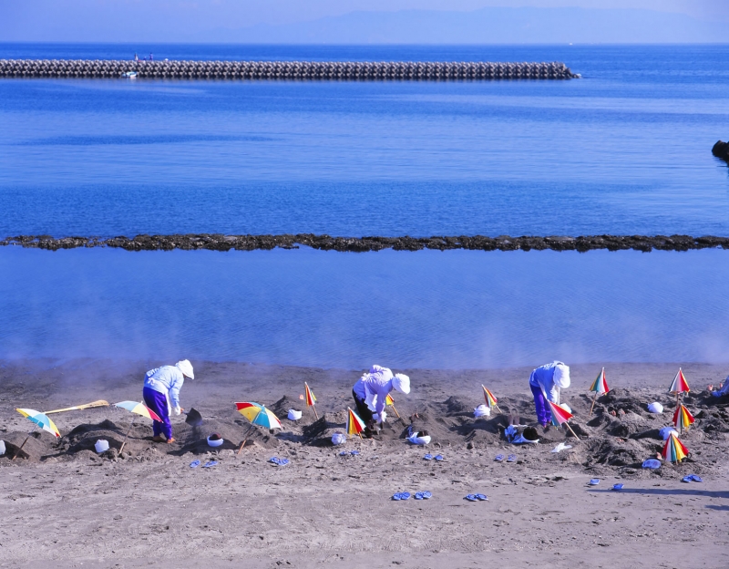 温泉で暖められた砂の中に身体を埋める形で入浴する、珍しい「砂むし風呂」が人気の温泉。錦江湾に面する温泉地で、温泉街の背後には指宿のシンボル的存在である開聞岳がそびえています。指宿温泉のお湯の泉質は無色透明の塩化物泉で、高い保温効果が特徴です。