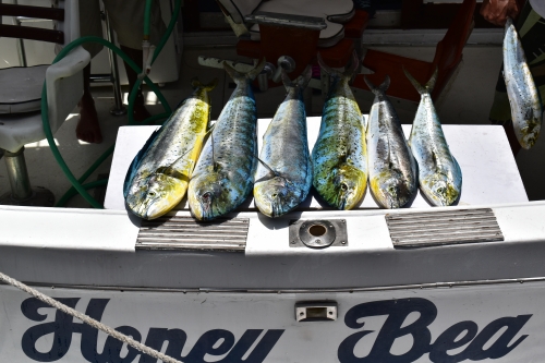 観光客を乗せて帰ってきたばかりのクルーザーが、釣ってきた魚を捌いています。