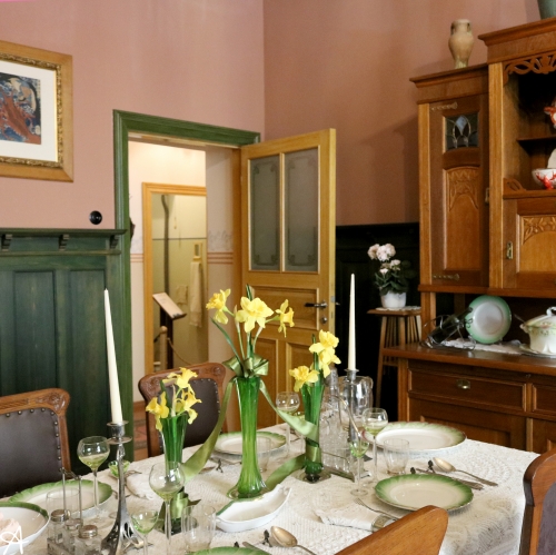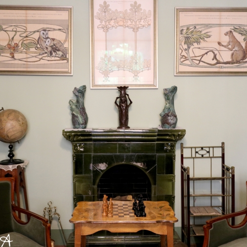 美術館の中には、キッチン・ダイニング・寝室等の展示や、当時の衣装を着て写真を撮ることができるフォトブースがあります。壁のペイントや額縁に飾られている絵は、動植物をモチーフにしており、アールヌーボー建築とリンクするところがあります。