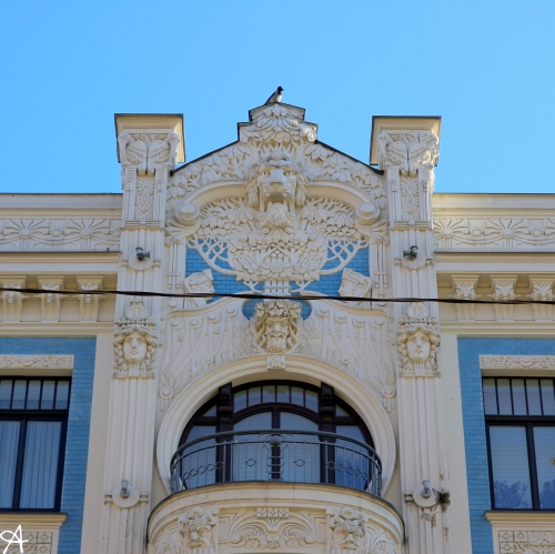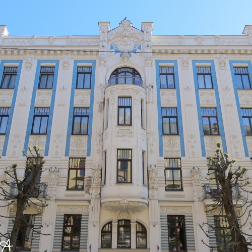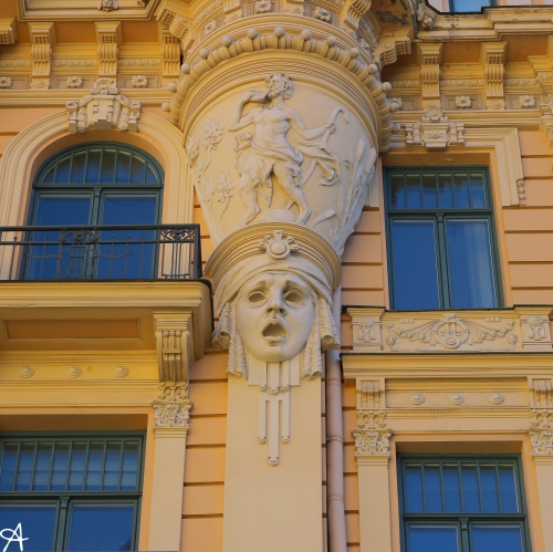 リガの歴史地区から歩いて15分。この通りには、観光案内所で無料でもらえる地図にも載っている、大きな「横顔」が有名な建物があります。白と水色の高貴な雰囲気に、人間離れした装飾が面白い建物です。
