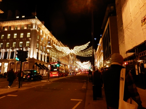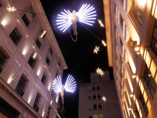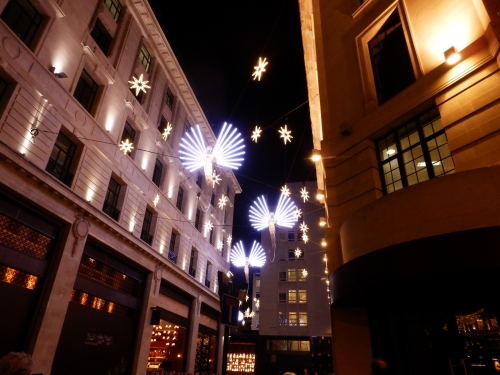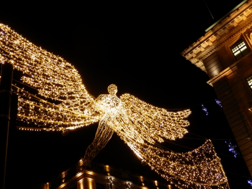 リージェント・ストリート(Regent Street)のイルミネーションは、毎年モチーフが変わるとか…2016年は、天使のようなオブジェが空を飛んでいました。