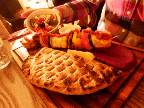 サラダがついたチキンシュプレームは、ヘーゼルナッツのペーストをつけると味がさらにまろやかになります。チキンたっぷりのギリシャ風バーベキューは、ピタパンもついてボリュームたっぷりです。