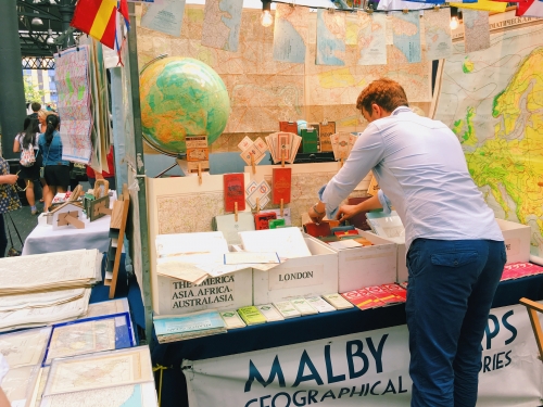 マーケットで見つけた、地図専門の露店。ロンドンの地図はお土産や記念品としてもぴったり。また空き瓶を時計やコップ、小物入れにしたユニークな露店も発見。素敵な発想のアイテム、きっと話題作りに一役買ってくれることでしょう。