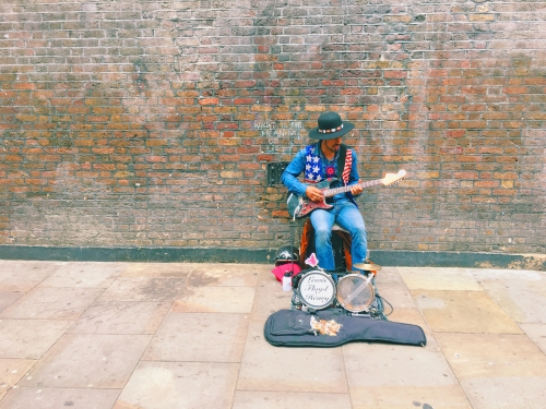 ギターとミニドラムを同時に操る路上パフォーマーを発見。思わず足を止めてしまいました。