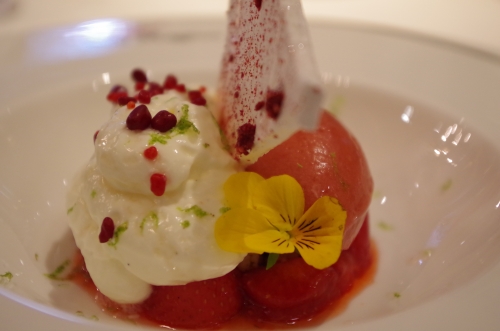 前菜は何と言ってもトリュフの香りと味が贅沢な一品でした。メインは牛がとても柔らかく、バターのきいたソースが濃厚。デザートは爽やかなソルベと優しい甘さのパンナコッタ、メレンゲクッキーのバランスが絶妙な一品でした。