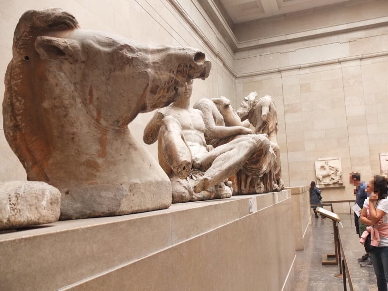 ロゼッタ・ストーンからグレート・コートを背にして、まっすぐ突き当りまで進みましょう。パルテノン神殿の破風彫刻が展示されているRoom18になります。エルギン伯爵がギリシアから持ち帰った彫刻群は、パルテノン神殿の東側の破風(屋根の一部)を装飾していたものです。2000年も前のものとは思えない、緻密かつ力強さを感じる彫刻です。伯爵の名前からエルギン・マーブル(大理石)と呼ばれています。
