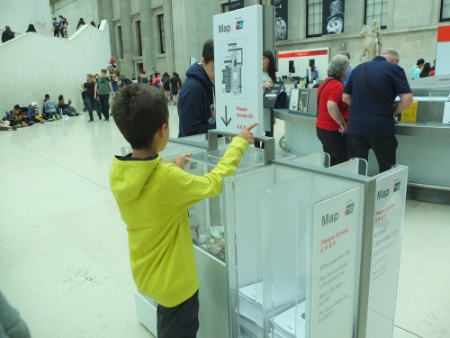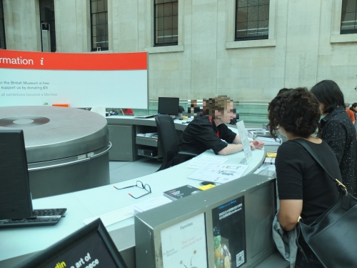 右手に館内インフォメーションがあります。マルチメディアガイドの貸し出し(£7/¥985)もしているので、レンタルすると便利です。モノクロマップは無料で、カラーは有料になります。入場料金が無料なので、できれば寄付をするか、ショップやカフェを使用して貢献したいですね。
