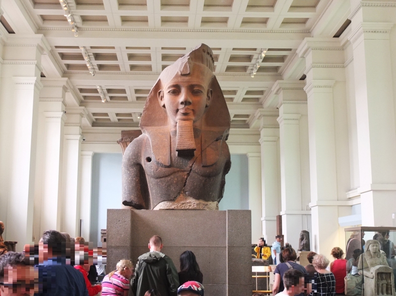 ロゼッタ・ストーンと同じ部屋にあるラムセス2世の胸像。高さ2.67m、重さ7.25tもある虚像は、1816年にエジプトから運ばれました。ナポレオンは、エジプト遠征時に持ち帰ろうとしたのですが、その重さに断念したそうです。右胸にあいている穴は、その時の努力の証となっています。