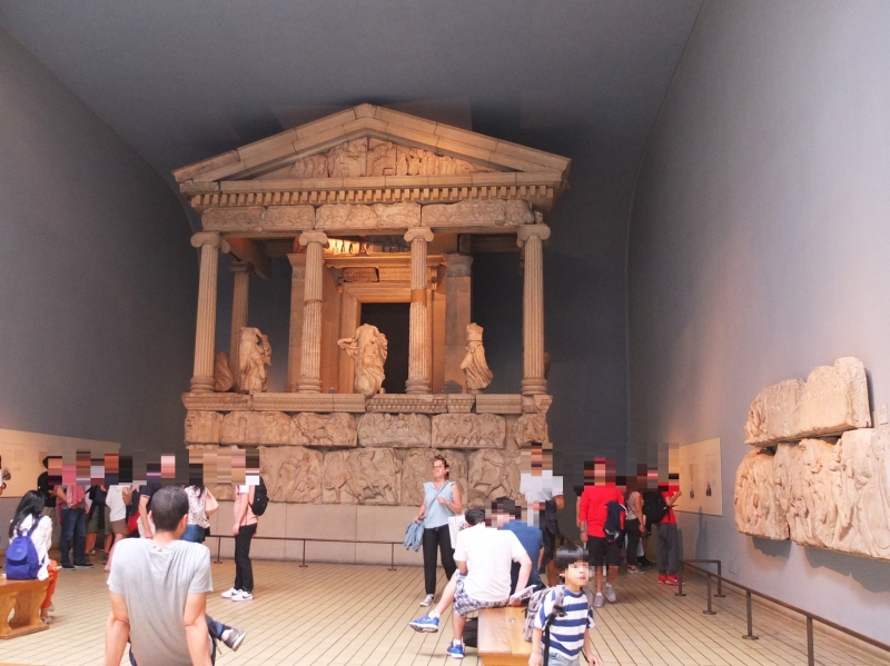 破風彫刻を見学後は、グレート・コートに戻りながら、見学しましょう。Room18を背にして、一つ目の部屋Room17は、まさにギリシア神話の世界が広がります。現在のトルコ南西部で発見された神殿風の墓廟です。