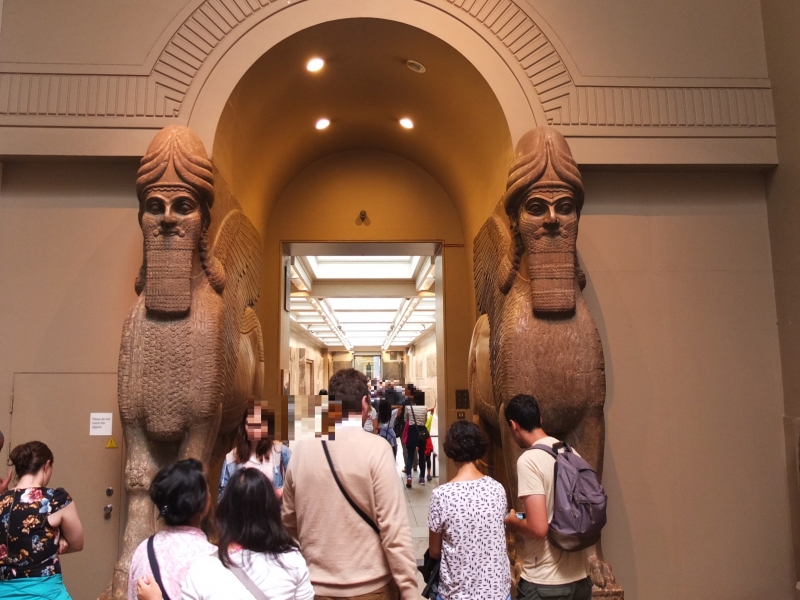 グレート・コートに戻る途中、通路の途中Room10には、アッシリアの人面有翼牡牛像が、複数体展示されています。1枚岩で作成されたラマッソスと呼ばれる像で、紀元前7世紀に、守護神として王宮の入口や城門に飾られていたもの。