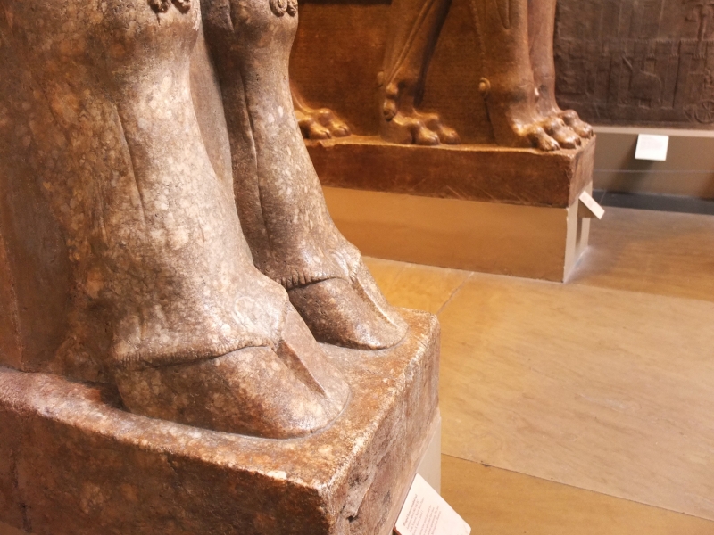頭部は冠をかぶった人間、体は羽根のある牡牛、前から見ると前足が2本、横から見ると3本足という不思議な動物像です。博物館内で一番大きな展示物なので、見逃すことはないと思います。