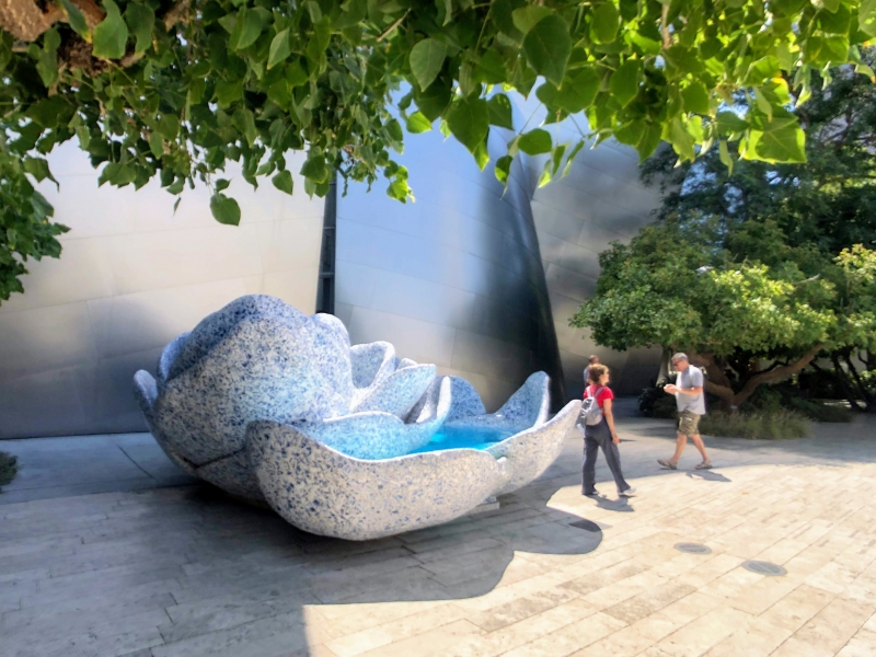 ゆるやかなうねりが重なる独特の外観をしているのが「Disney Concert Hall(ディズニーコンサートホール)」。2003年に完成したこちらのホールは、その外観の美しさだけにとどまらず、音響の良さや内装の見事さでも知られています。