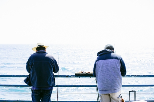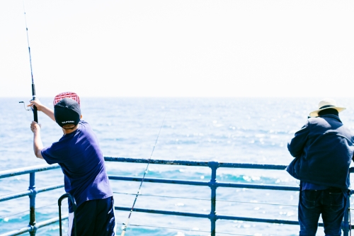釣り竿を貸し出しているスペースがあるので、借りて自由に釣りを満喫することができます。エサを用意する人、波が押し寄せる中釣り竿を思い切り振るう人、その人たちを見守るギャラリーの人たちと様々いました。