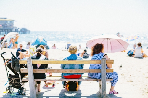 桟橋を降りると、そこにはビーチが広がっており、ここでも多くの人たちが気持ち良さそうにバカンスを楽しんでいます。海ではしゃぐ人たち、砂浜で日焼けをする人、ベンチに座って日傘を差しながら、盛り上がっているビーチを温かい目で見ている人たちなどでにぎわっています。