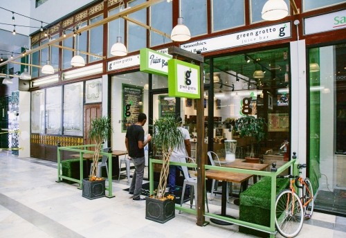 写真:トラベルライタージュースバー「Green Grotto Juice Bar」。オーガニックなフレッシュジュースやスムージー、アサイボウルなどの健康的な飲食を堪能できます