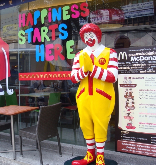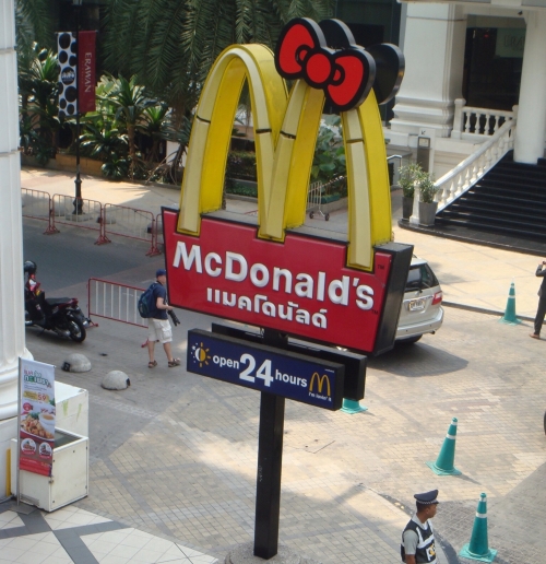 「アマリン・プラザ」では、「微笑みの国」ならではの挨拶をするゾウがお出迎え。また、建物を出てすぐのところにあるマクドナルドもタイ式の挨拶をしています。