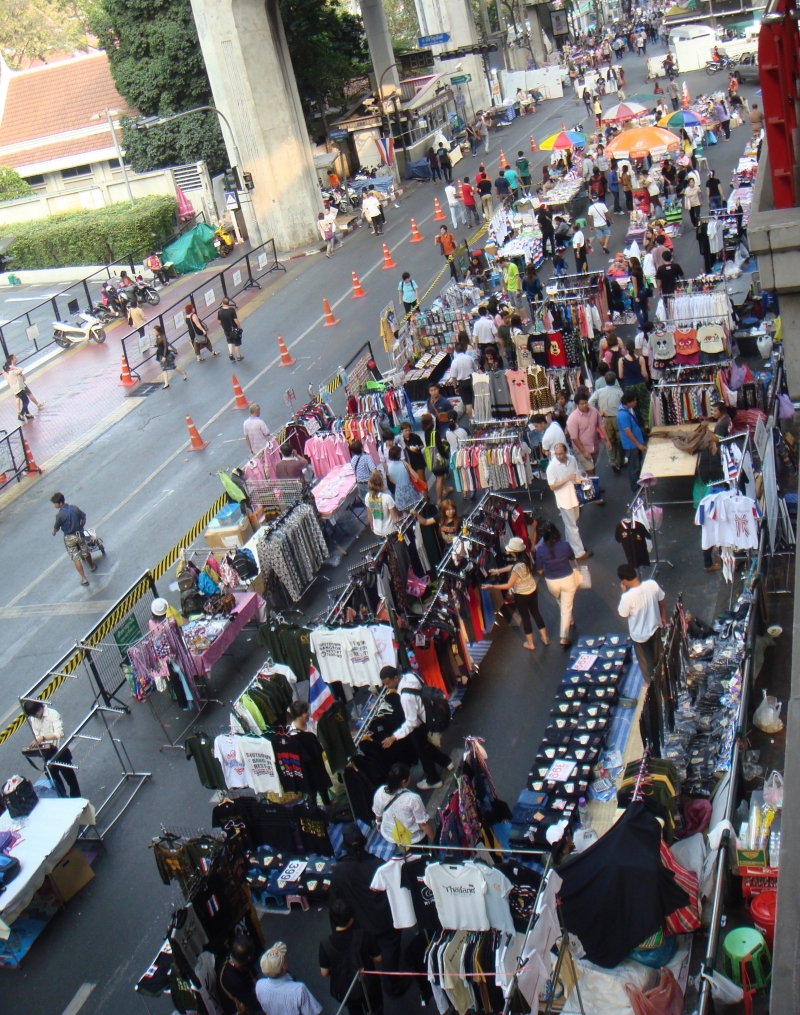 上で紹介したショッピングモール同士をつなぐスカイウォークの下では、道路の一部を使ってマーケットが開かれます。チャトゥチャック・ウィークエンドマーケットに比べると凝った雑貨は少ないですが、アクセサリーや服が安く手に入ります。