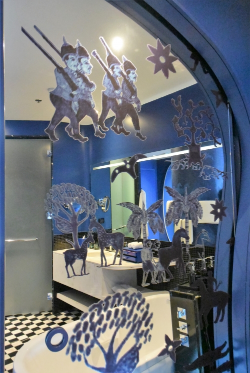 「アース」の部屋に決めるときは少し勇気が要りましたが、筆者は思い切って予約してよかったです。部屋の壁に描かれた絵は全く子供っぽい印象はなく、壁のブルーもとても深い落ち着いた色合いです。宿泊前には不安がっていた夫も気に入った様子です。個人的にはバスルームのお猿の壁画が気に入り、前を通るたびにハッピーな気分になりました。自分好みの壁画を見つけるのも楽しいかもしれません。