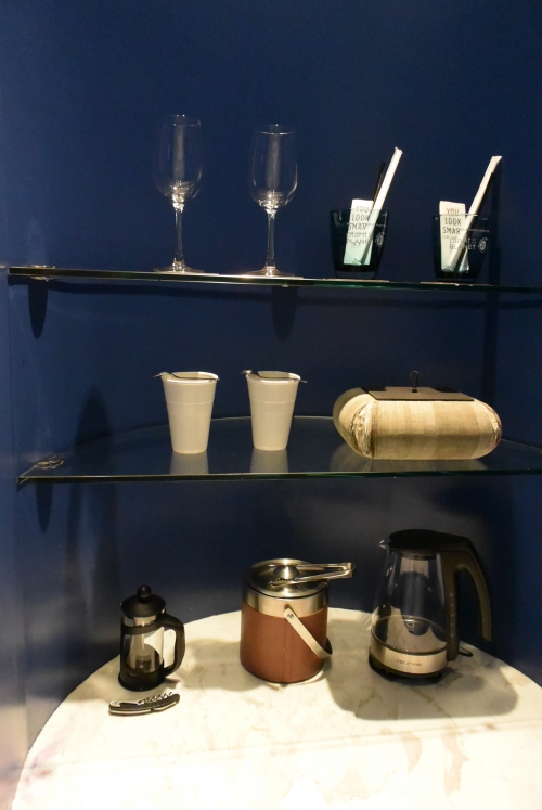 一番人気は「ウォーター」のようですが、筆者はあえてとても個性的な内装の「アース・エレメント・ルーム」を選択しました。エレベーターを降りると、深い落ち着いたブルーの廊下が続いています。不思議と大きな「地球」の中にいるような感覚になり、心が穏やかになる気がします。