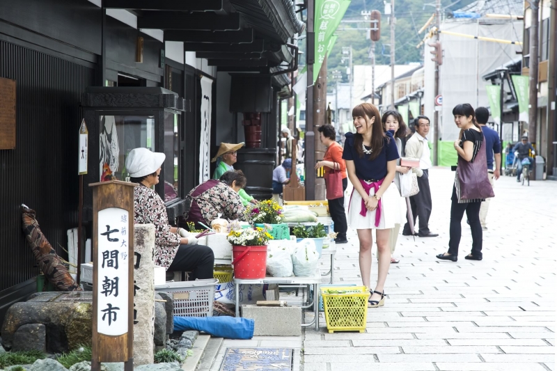 400年以上の歴史がある七間朝市。石畳みの七間通りに地元農家のおばちゃんたちの活気ある声が響き、ついあれこれ買いものをしたくなります。大野名物の絶品サトイモや、地物の野菜、手作り醤油、味噌、梅干しなどが所狭しとならび目移りすることまちがいなし。大野に行ったら早起きして朝市に出向くと、掘り出しものが見つかるかも♪