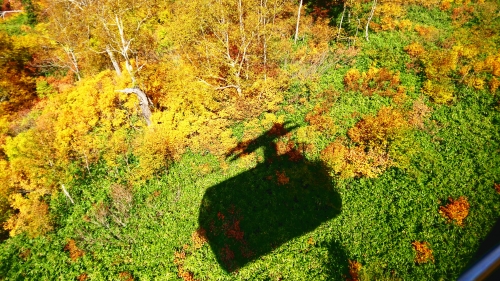 ロープウェイの中から早速、どこを見渡してもダイナミックな紅葉をご覧いただけます。紅葉といえば、もみじの赤を想像される方が多いと思いますが、こちらの紅葉は森林限界にある白い枝が特徴の「ダケカンバ」などのイエローな紅葉が主流です。それらを眺めながら姿見駅を目指します。