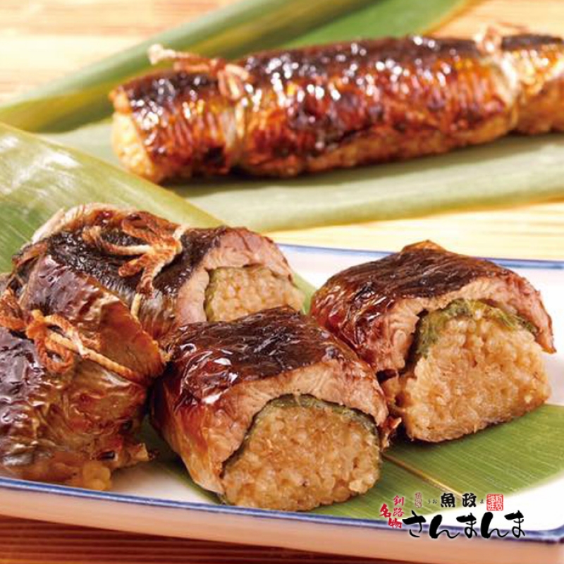 まずは脂の乗った新鮮なサンマを食べやすいように骨を取り除き、秘伝の醤油ベースのタレに漬け込んでから、餅米をブレンドしモチモチとした食感に炊きあげた北海道産米の炊き込みご飯をサンマで巻いてから、香ばしく炭火で焼き上げます。サンマとお米の間に挟んだ大葉も良いアクセントに。手間暇かけたここにしかない絶品の「さんまんま」、ぜひ味わってみてください。(2本入り 1,400円 ※価格は時期によって変動する場合があります。)