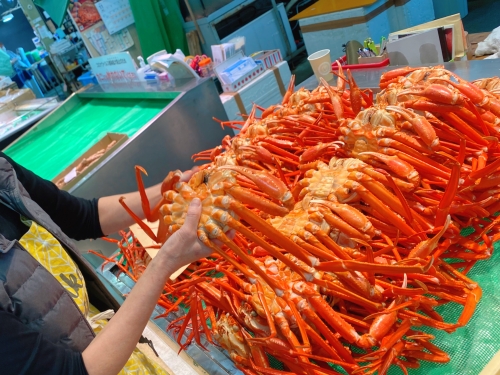 今回筆者は「新田商店」の「紅ズワイ蟹(1杯2,000円)」を市場内でいただきました。1本足がないですが、2,000円で大きな蟹がいただけるなんてとても嬉しいですよね?ちなみに、もうワンサイズ小さい紅ズワイ蟹は1,500円で販売されていました。身がしっかりしていて蟹の味も濃く、蟹みそもたっぷり入っていて、とても美味しかったです。
