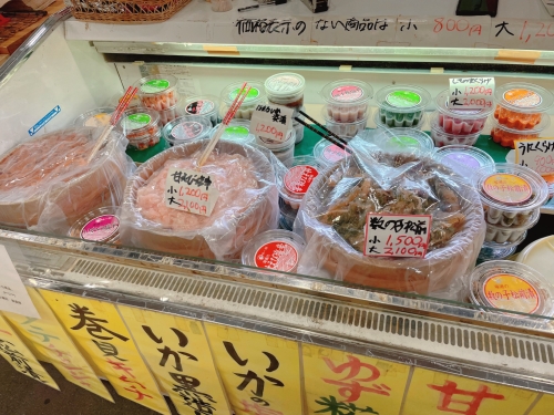 お土産に珍味はいかがでしょうか?「海道屋」では、種類豊富な珍味が販売されています。今回筆者は贈り物用として、「エビの塩辛(小1,200円)」と「のどぐろ干物(1枚2,600円)」を購入しました。干物は、のどぐろの他、ホッケ、カレイなどそろっていましたよ。
