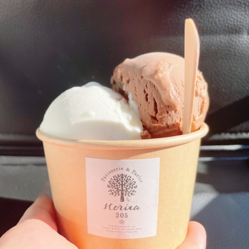 施設内に入っている「Horita 205 UCHINADA(ホリタ・ニーマルゴ・ウチナダ)」では、フルーツを使ったスイーツが人気‼今回筆者は「とちあいかタルト(620円)」と「ジェラート(トリプル/680円)」をいただきました。とちあいかタルトは、苺の甘さと酸味のバランスがとても良く、その上、主役の苺がゴロゴロはっていてとても贅沢な品でした。タルト生地自体も美味しく、外はサクっと、中はしっとりしています。