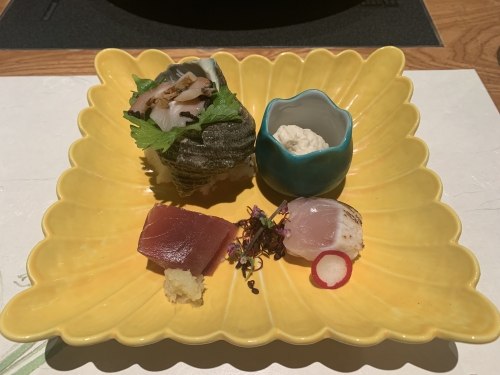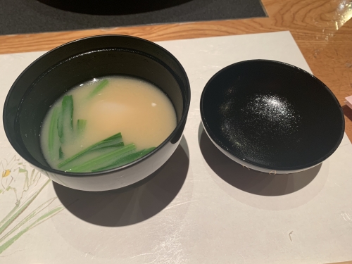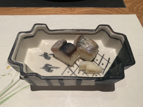 こちらは鯖炙り寿司と先椀です。先椀は西京仕立てで小松菜が入っています。