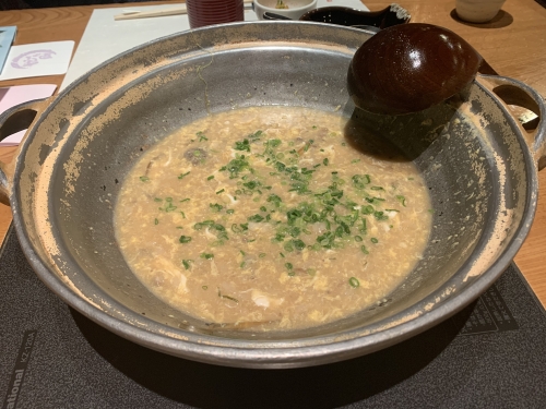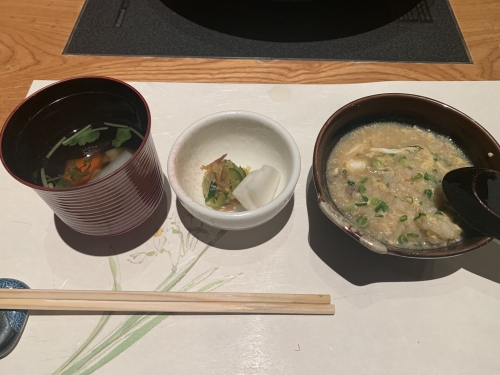 海鮮しゃぶしゃぶの後はその出汁で頂く海鮮出汁雑炊。そして、香の物です。海鮮の味がしっかりと効いた出汁は非常に美味でした。