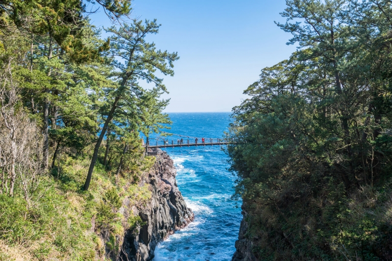 城ヶ崎ピクニカルコースの中間にある、全長48m、幅1.5m、高さは23mの「門脇つり橋」は城ヶ崎海岸のシンボル。眼下には白い波が激しく打ち寄せスリル満点です。つり橋の近くには高さ24.9mの門脇崎灯台があり、無料で登ることが出来ます。地上4m、17mの2ヶ所に展望台が設けられており、そこからの眺めも最高ですよ。