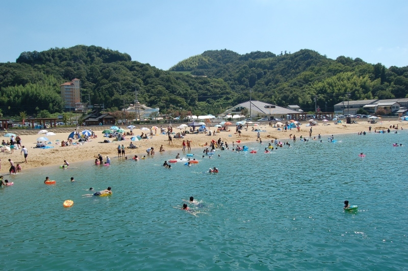 向島と因島を結ぶ因島大橋のたもとにある海水浴場。ビーチには高さ9メートルのスライダーが人気の「因島アメニティープール」が併設し、海とプール両方楽しめるのが特徴です。海の家も2軒オープンしており、夏は家族連れで大変賑わいます。ビーチから見える夕日も格別!