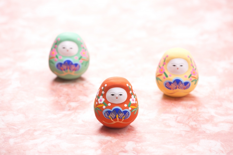 七転び八起きの縁起のよい置物として、金沢で愛玩されている「加賀八幡起上り」。天皇の御幼体を赤い綿布でくるんだ姿から発想されたもので、型に和紙を貼り、胡粉、朱を塗り、松竹梅を描いた可愛らしい置物です。