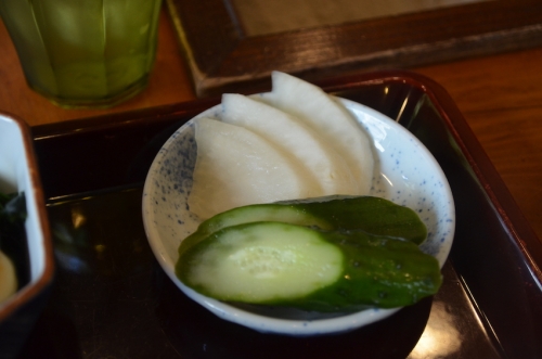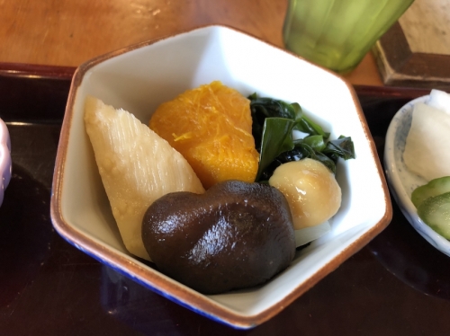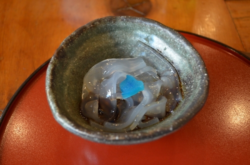 深川めし以外もたいへん美味しく、漬物や煮物も隙のない食べ応えでした。食後はデザートの「くず切り」がついてきます。