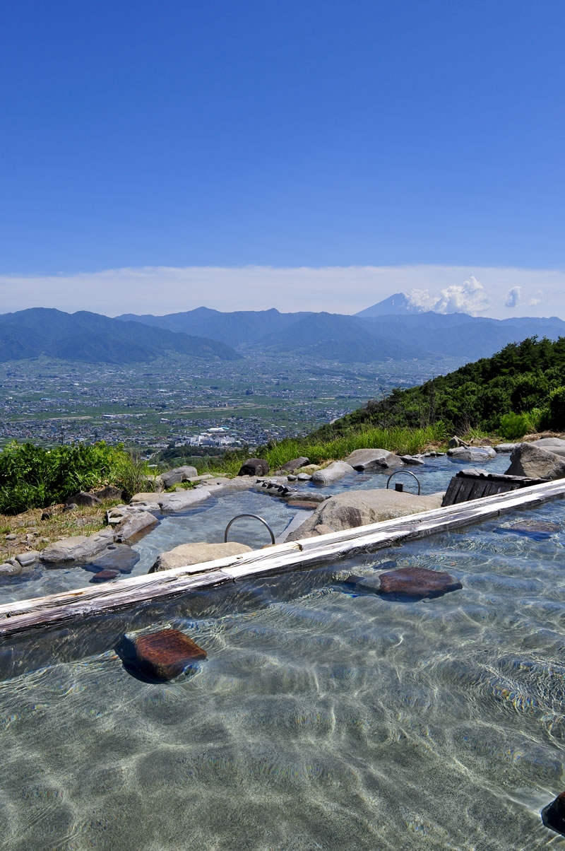標高700mの場所にある天然温泉。真正面には富士山、眼下には甲府盆地の絶景を楽しめ、連日大人気です。